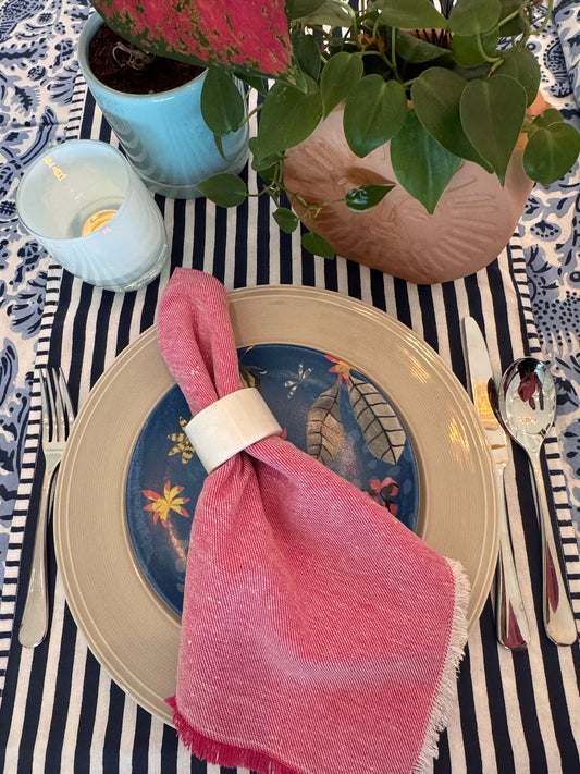 Decorate with this fresh take on classic Americana style. The Red, White & Blue Edit brings together artisan-made napkins, tablecloths, and accessories in festive shades of cranberry red, crisp white, and rich navy—perfect for summer gatherings, backyard barbecues, or cozy dinners all year long. Mix, match, and layer for a style that feels patriotic without being predictable.