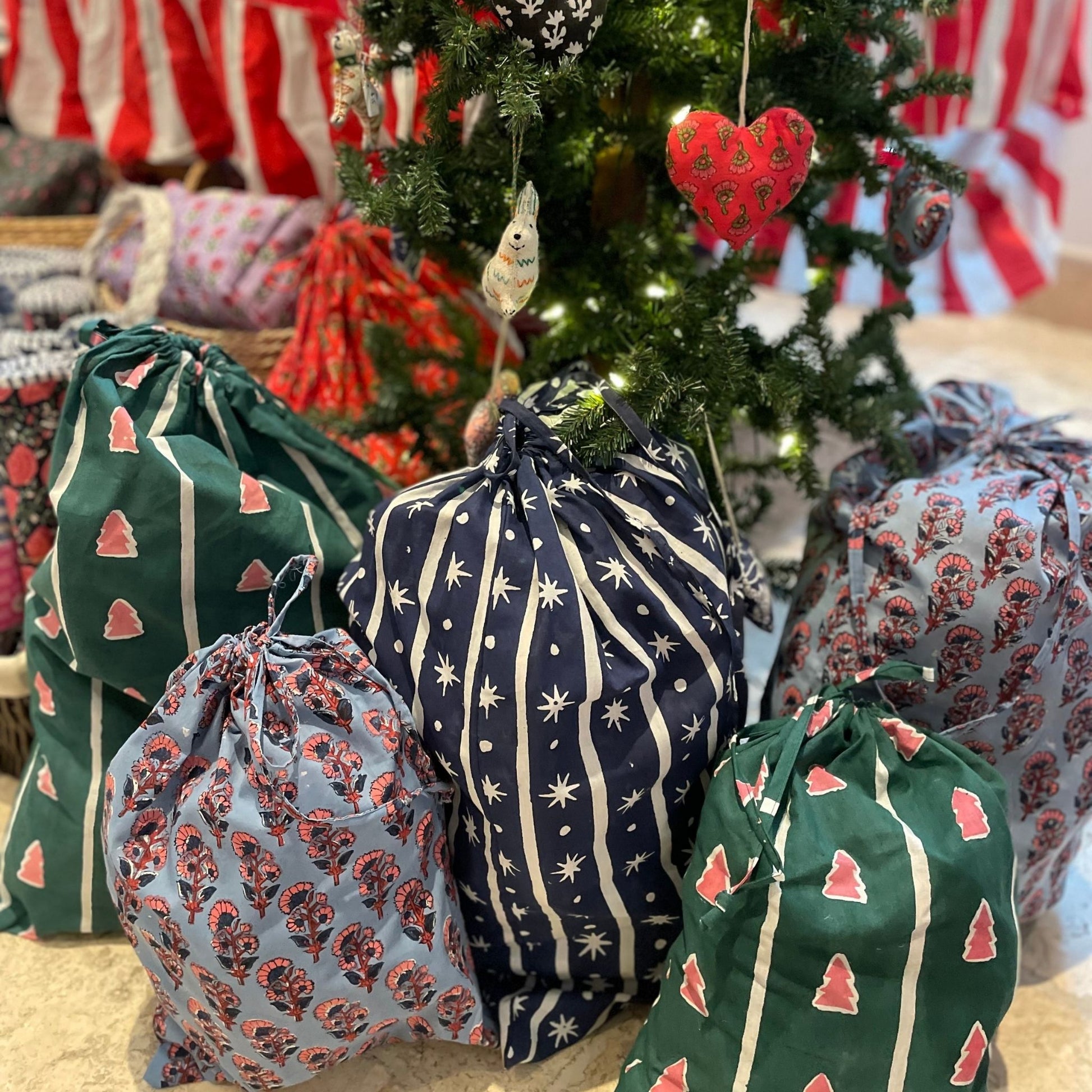A reusable cotton gift bag you’ll reach for every season. Quincy & Coco's durable drawstring gifting sack makes wrapping fast, waste-free, and beautiful—perfect for birthdays, holidays, hostess gifts, travel organizing, or tucking into a tote. Made from soft 100% cotton and hand block printed with beautiful designs, each bag folds flat for easy storage and can be reused again and again.