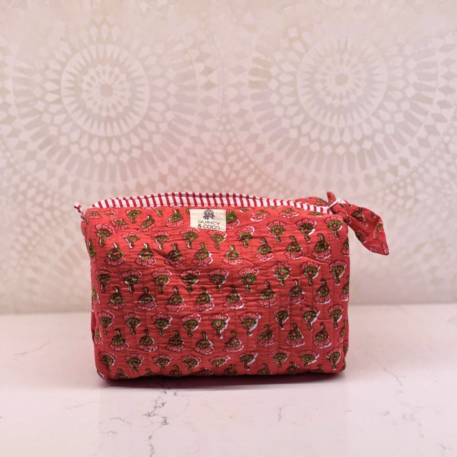 Quincy & Coco quilted makeup bags are bright, bold, and beautifully functional. Each one is handmade from soft, hand block-printed Indian cotton and finished with a water-repellent inner lining and four interior pockets to keep your cosmetics and toiletries neatly organized. A playful cloth zipper pull adds the perfect artisan touch.