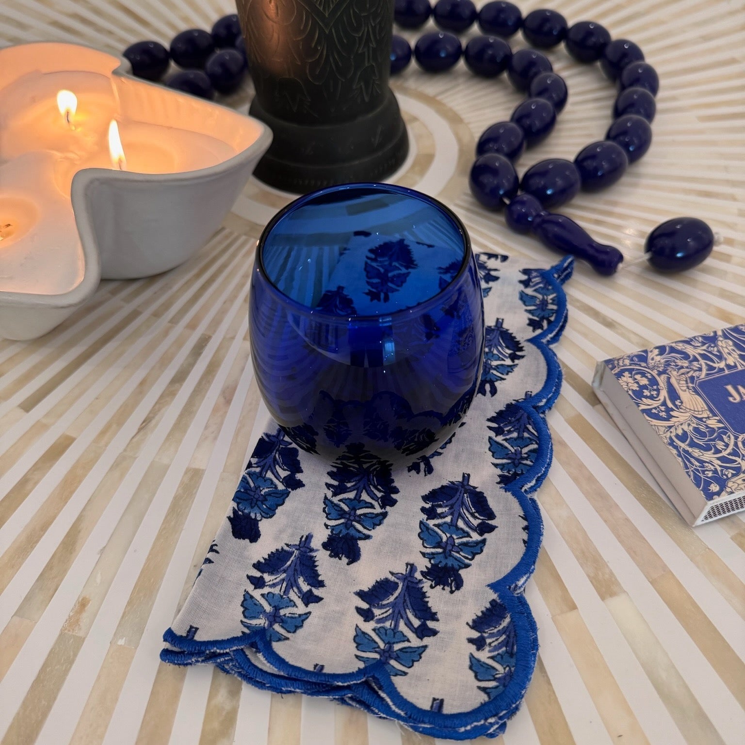Add joy to your tabletop with our festive block-print napkins with scalloped edged. Handmade in India, these floral blue and white napkins are meticulously hand block-printed and hand embroidered with a striking blue scalloped edge. Being made by hand invites small and beautiful imperfections in the prints.