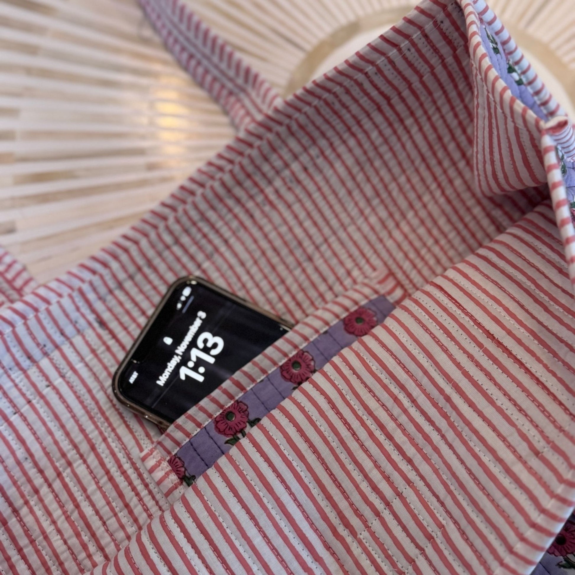 Our quilted tote bags are bright, bold and fun! The shell and lining both feature beautiful block print fabric in lilac purple, with green and pink flowers. Made by artisans in India, these totes are made of meticulously hand block-printed cotton.
