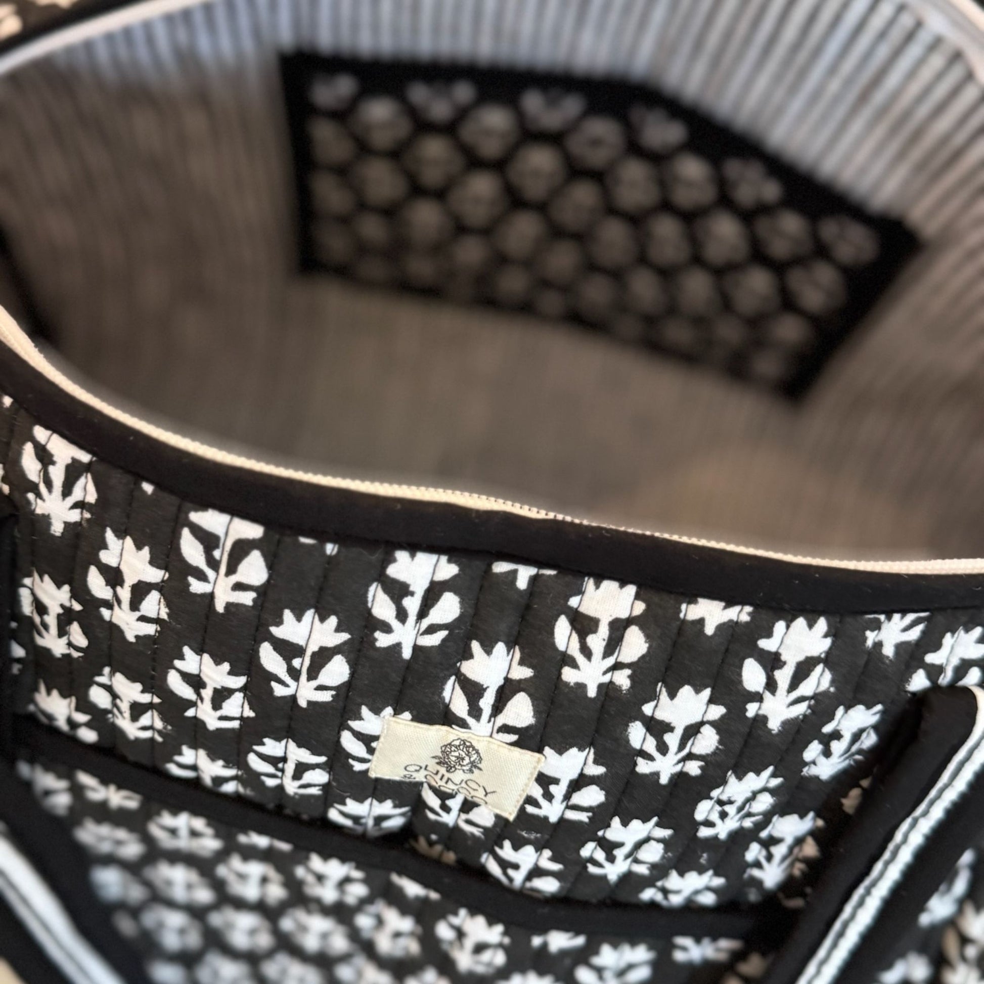 Our quilted duffel bags are bold and fun! Handmade in India, these weekender bags are made of meticulously hand block-printed Indian cotton. Perfect for travel, including a trolley strap to sit on your roller bag.