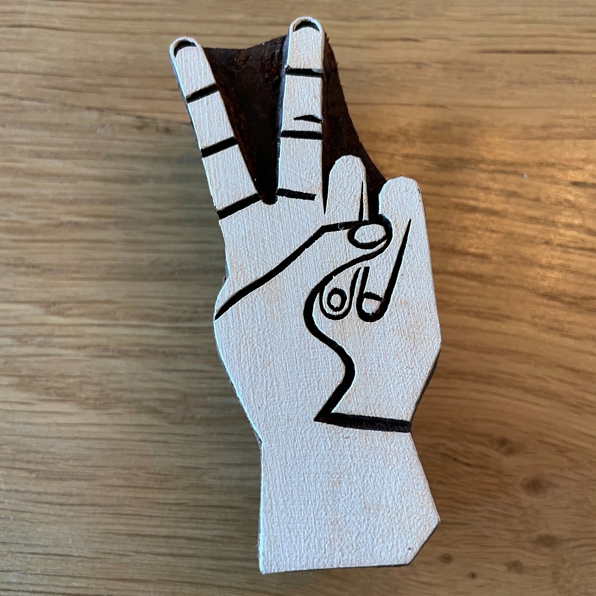 - Hand-carved wood printing block - Peace hand; approx. 3"Â