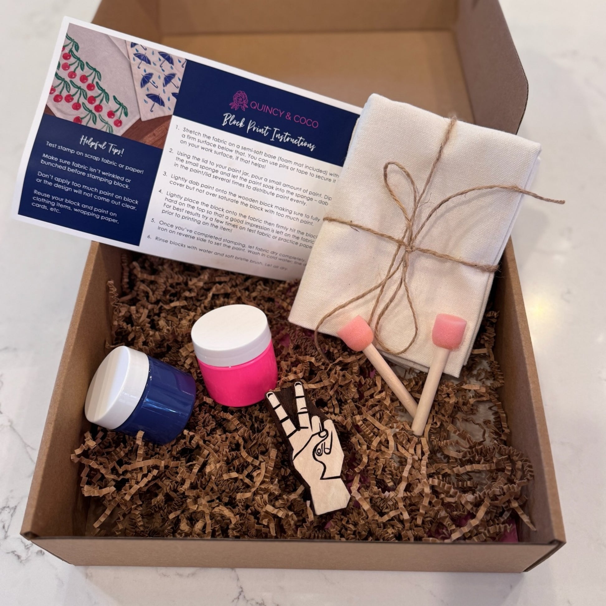 Unbox creativity, joy and peace with a Quincy & Coco at-home Block Print Kit. This is a complete step-by-step experience that brings the ancient craft of Indian block printing to your fingertips.Â