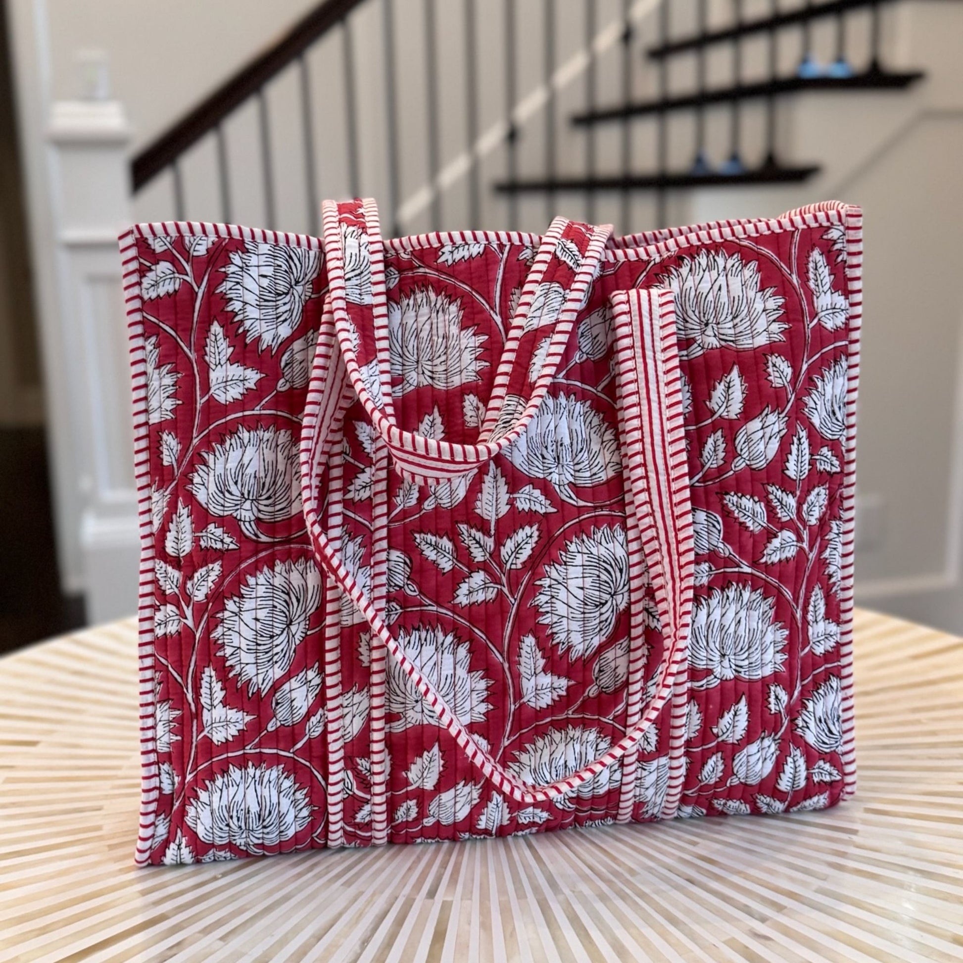 Our quilted tote bags are bright, bold and fun! The shell and lining both feature beautiful block print fabric. Handmade in India, these totes are made of meticulously hand block-printed Indian cotton. Being made by hand invites small and beautiful imperfections in the prints.