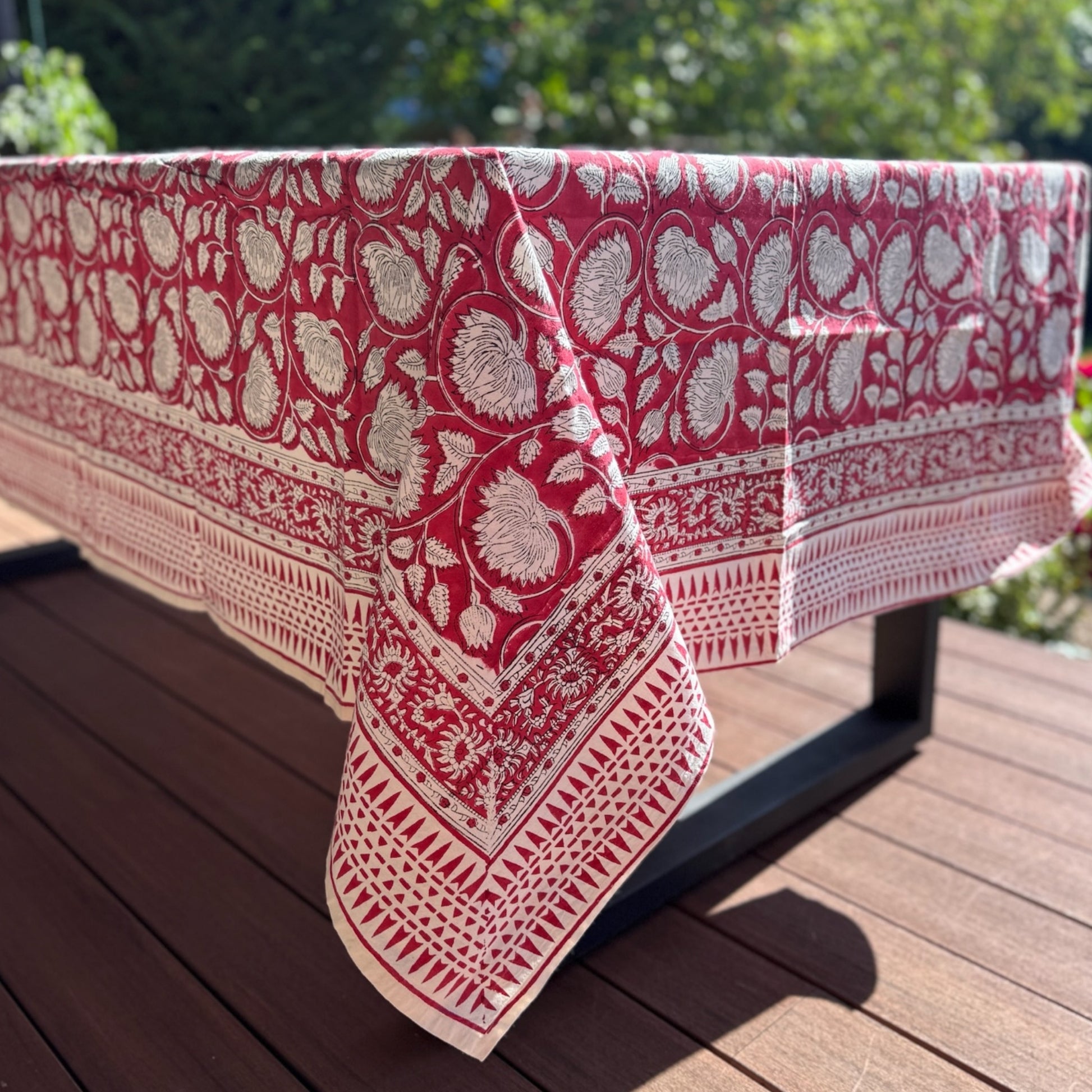 Add joy and a splash of color to your tabletop with our red and white block-print tablecloth. Handmade in India, this tablecloth is meticulously hand block-printed in a striking floral pattern with a contrasting border pattern. The joy of this tablecloth is that each is unique, no two are exactly alike! Being made by hand invites small and beautiful imperfections in the prints.