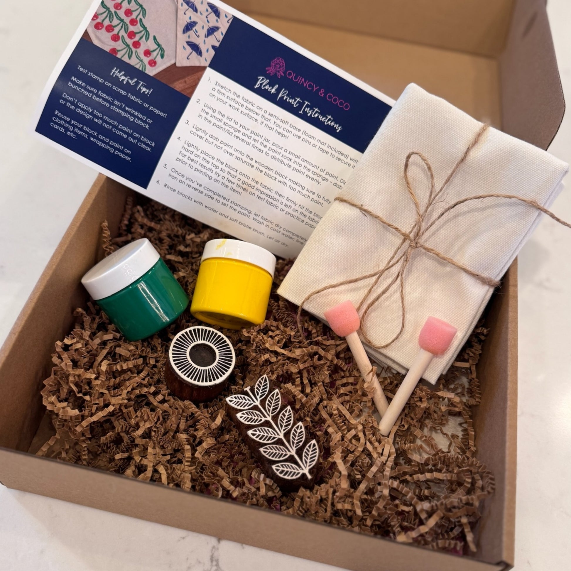 Unbox creativity with a Quincy & Coco at-home Block Print Kit, a complete step-by-step experience that brings the ancient craft of Indian block printing to your fingertips.Â